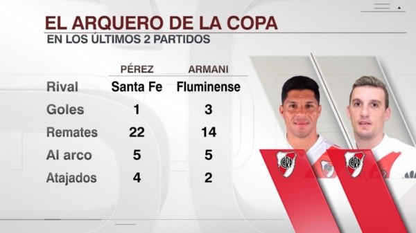 Tras el encuentro, en Sportscenter armaron una gráfica comparativa entre el encuentro del ‘1’ del Millonario y el de Enzo Pérez la semana pasada. Más allá de la sustancial diferencia de jerarquía entre Santa Fe y el Flú, la placa comparó remates intentados por el rival, tiros al arco, goles recibidos y atajadas. ¡En todo gana el mediocampista!
