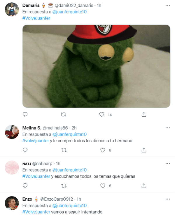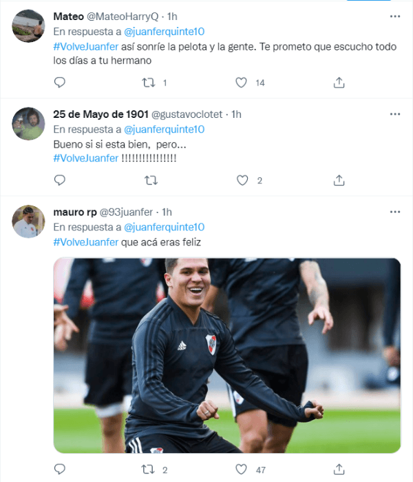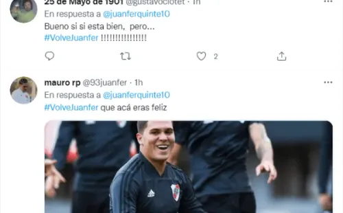 Los simpatizantes del club de Núñez se organizaron para ubicar el hashtag #VolvéJuanferen la primera tendencia de Twitter en Argentina. Los hinchas se manifestaron en redes a favor de un ansiado regreso del engancheque hoy milita en las filas delShenzhen FC de la Superliga de China, a poco más de un año de su despedida de River.
