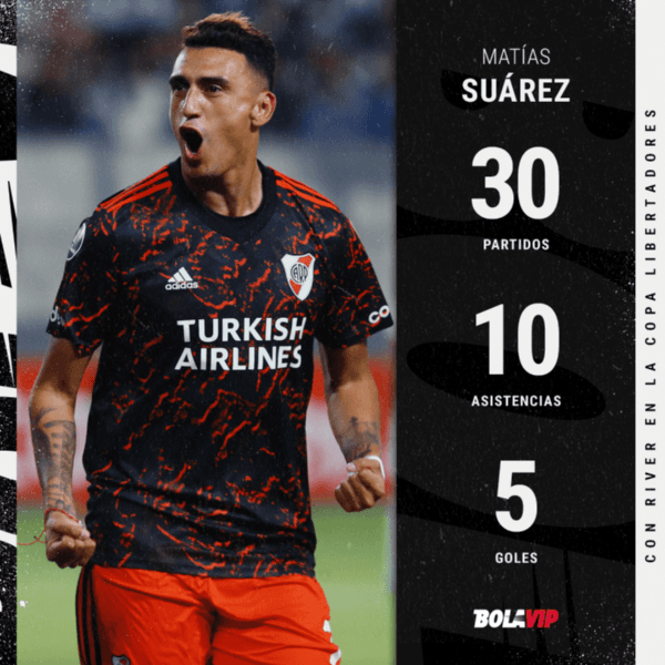 Si contabilizamos el compromiso de esta noche, Suárez alcanzó las 15participaciones directas en 30 partidos disputados para River en la Copa Libertadores. En números, logró convertir 5 tantos y aportó 10asistencias, influyendo en un 34% de los goles del equipo. Lo particular: solo 22fueron disputados desde el arranque. Letal.