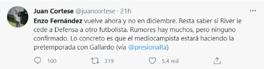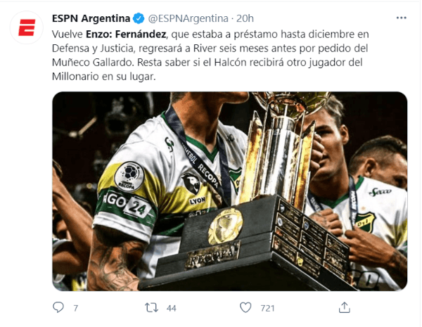 Gran noticia para Marcelo Gallardo. Hace tiempo que se hablaba de la posibilidad de que Enzo Fernández termine su préstamo con Defensa y Justicia de manera anticipada para volver a River, club dueño de su pase. Y ahora son varios los medios que lo dan por oficial, aunque todavía desde la institución no hicieron ningún anuncio.