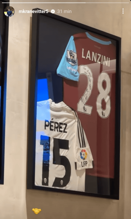 A través de una historia de Instagram, el volante central compartió una foto de uno de sus cuadros, donde está la camiseta de Enzo Pérez (de cuando jugaba en Valencia) y Manuel Lanzini (West Ham). Además, lo acompañó con un sugerente emoji de apretón de manos…