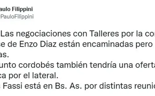 Cuando todo parecía encaminado para que Díaz se convierta en el tercer refuerzo de la temporada 2023 para el Millo, el periodista partidario Paulo Filippini no entregó novedades positivas. “Las negociaciones con Talleres por la compra del pase de Enzo Diaz están encaminadas pero no cerradas”, advirtió.