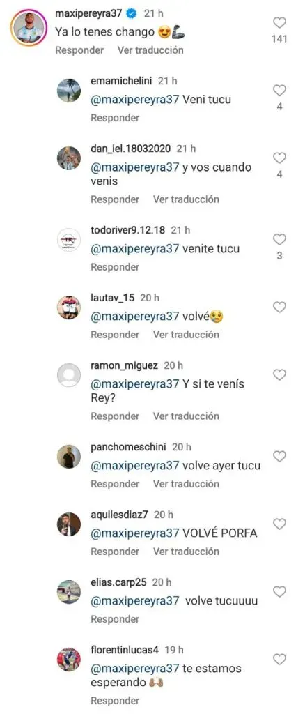 Buscando convencerlo de pegar la vuelta, los hinchas de River empezaron a comentar la publicación: “¿Y cuándo volvés vos?”, fue una de las preguntas que más apareció en el post junto al “volve Tucu” que tanto resuena últimamente entre los fanáticos del Millonario.