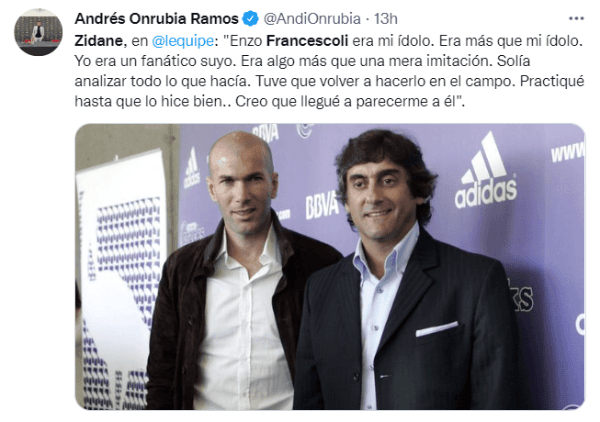 El presente los encuentra en el mundo del fútbol, pero fuera de la cancha. “Después nos hicimos amigos de Enzo. Comimos varias veces juntos en Madrid y nos mantenemos en contacto, incluso si él está muy ocupado”, contó Zizou sobre la actual relación que mantiene con su ídolo, hoy secretario técnico de River Plate. Un verdadero sueño cumplido.
