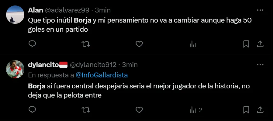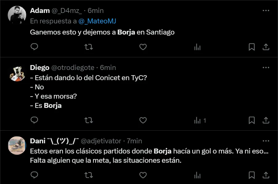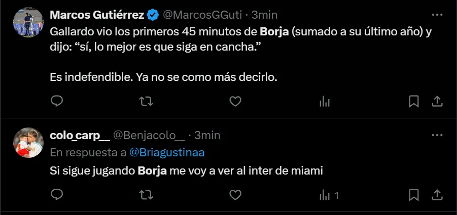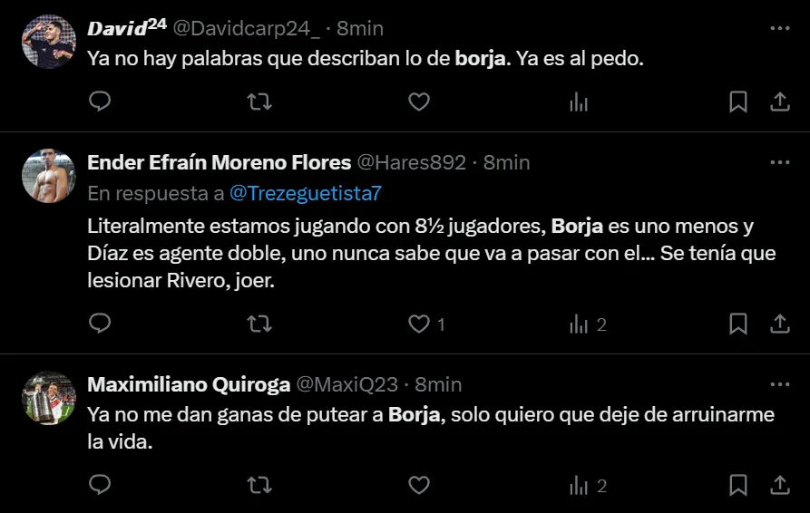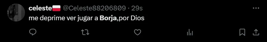 “Me deprime ver a Borja, por Dios”, exclamó en Twitter el usuario @Celeste88206809, como así también lo hicieron otros fanáticos que transformaron al ex Palmeiras en tendencia a nivel nacional. Entre las críticas, al Muñeco le pidieron por la salida del nacido en Tierralta, que disputó todo el encuentro.