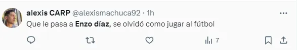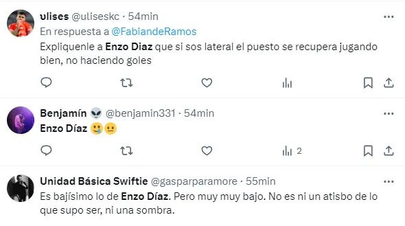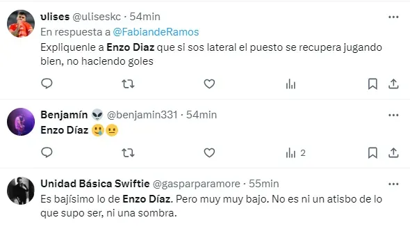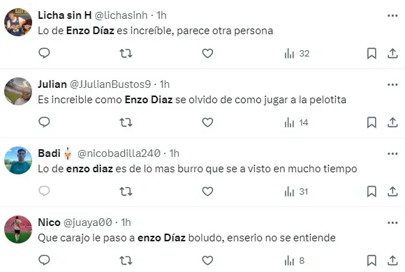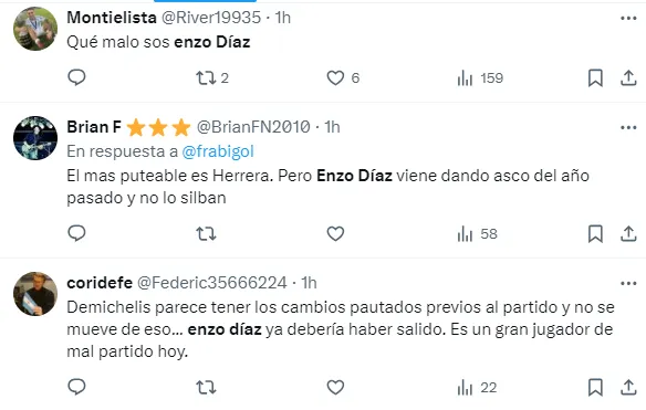“Lo de Enzo Díaz es increíble, parece otra persona”, “Es increible como Enzo Diaz se olvidó de como jugar a la pelotita”, “Basta de Enzo Díaz”, “Que le pasa a Enzo díaz, se olvidó cómo jugar al fútbol”, fueron algunos de los comentarios de los hinchas de River con respecto al lateral.