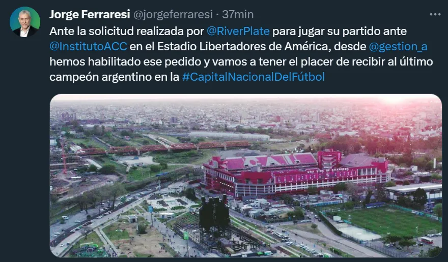 Por medio de su cuenta oficial de Twitter, fue Jorge Ferraresi quien manifestó que “ante la solicitud realizada por River Plate para jugar su partido ante Instituto en el Estadio Libertadores de América, desde Gestión Avellaneda hemos habilitado ese pedido y vamos a tener el placer de recibir al último campeón argentino en la #CapitalNacionalDelFútbol”.