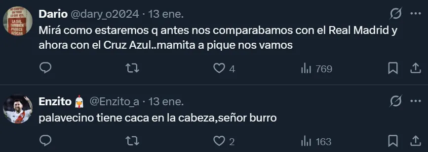 En diálogo con Récord, Agustín Palavecino fue consultado por la grandeza de Cruz Azul y afirmó: “Estuve en River, que también es un equipo grande, y veo la misma magnitud, la misma grandeza. Uno lo va tomado diferente y con la misma responsabilidad“. Esa declaración trajo con sí el enojo de los fanáticos del Millonario en las redes sociales.