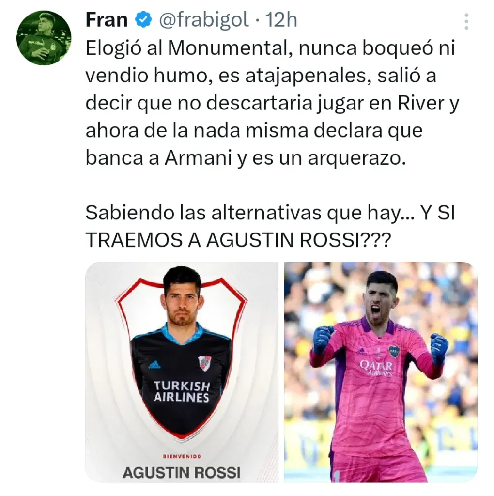 Tras anoticiarse de la defensa que Agustín Rossi había hecho de Franco Armani, no fueron pocos los hinchas de River que desde las redes sociales pidieron que lo vayan a buscar. “Elogió al Monumental, nunca boqueó ni vendio humo, es atajapenales, salió a decir que no descartaría jugar en River y ahora de la nada misma declara que banca a Armani y es un arquerazo. Sabiendo las alternativas que hay, ¿y si traemos a Agustín Rossi?”, propuso Fran, un fanático muy popular en X.
