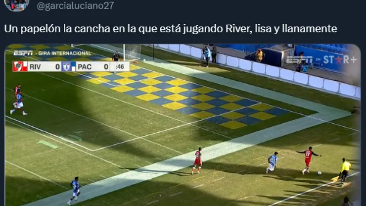 El Toyota Stadium fue sede de un partido de fútbol colegial y están marcadas las líneas de un típico campo de fútbol americano. En estas condiciones tiene que jugar River ante Pachuca. Hubo quejas en redes sociales.