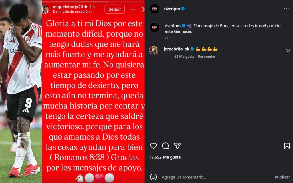 Tras caer ante Gimnasia y Esgrima La Plata en el Estadio Monumental y fallar un penal en el último minuto que hubiese sido el empate, Miguel Ángel Borja utilizó su cuenta de Instagram para publicar una llamativa historia. La Página Millonaria compartió ese contenido con una foto del Colibrí y, entre los comentarios de dicha publicación se hizo presente Jorge Brito, quien reaccionó con varios emojis de un brazo haciendo fuerza.