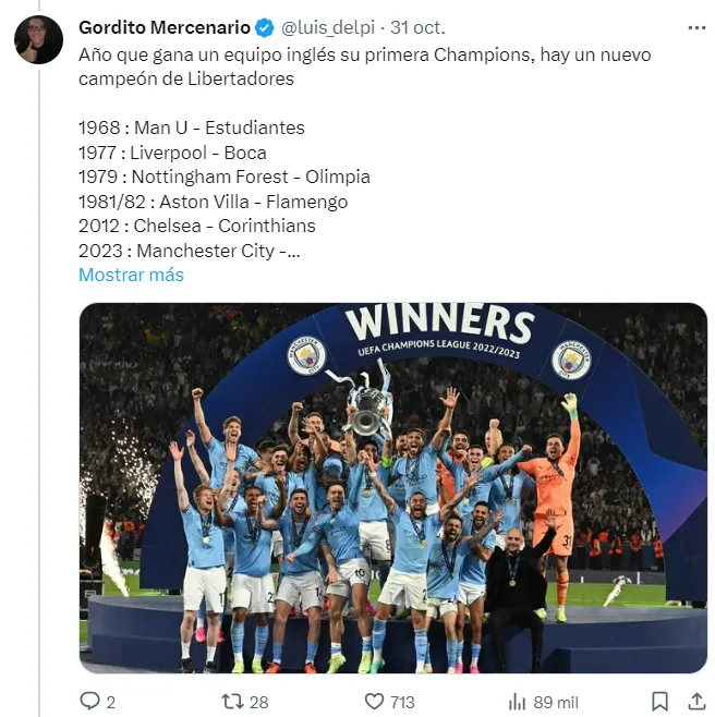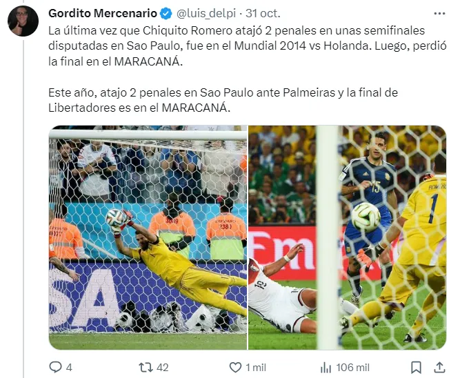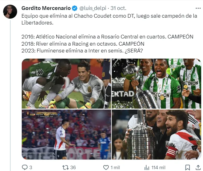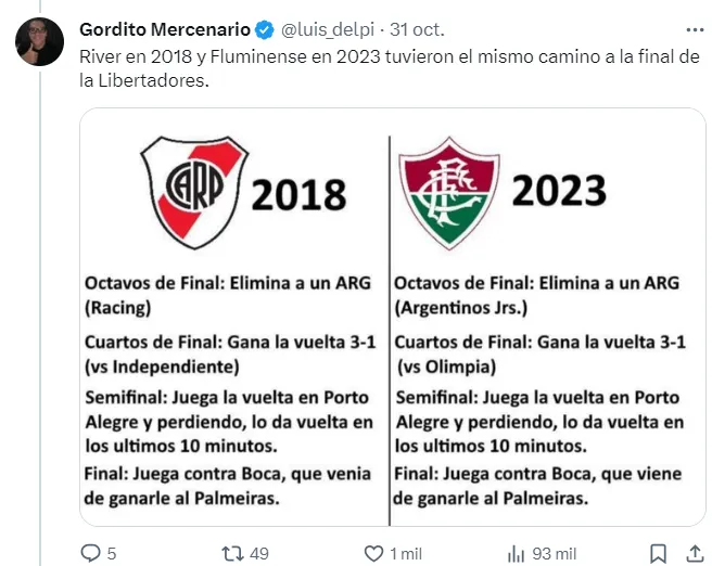 Pocos minutos después, a través de su cuenta de Twitter, el hombre en cuestión se hizo cargo. Se trata de Luis Delpi, recordado por haber hecho un hilo de coincidencias que daban a Fluminense como campeón de la CONMEBOL Libertadores.
