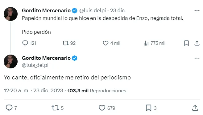 “Papelón mundial lo que hice en la despedida de Enzo. Pido perdón”, expresó y agregó: “Yo canté. Oficialmente me retiro del periodismo”.