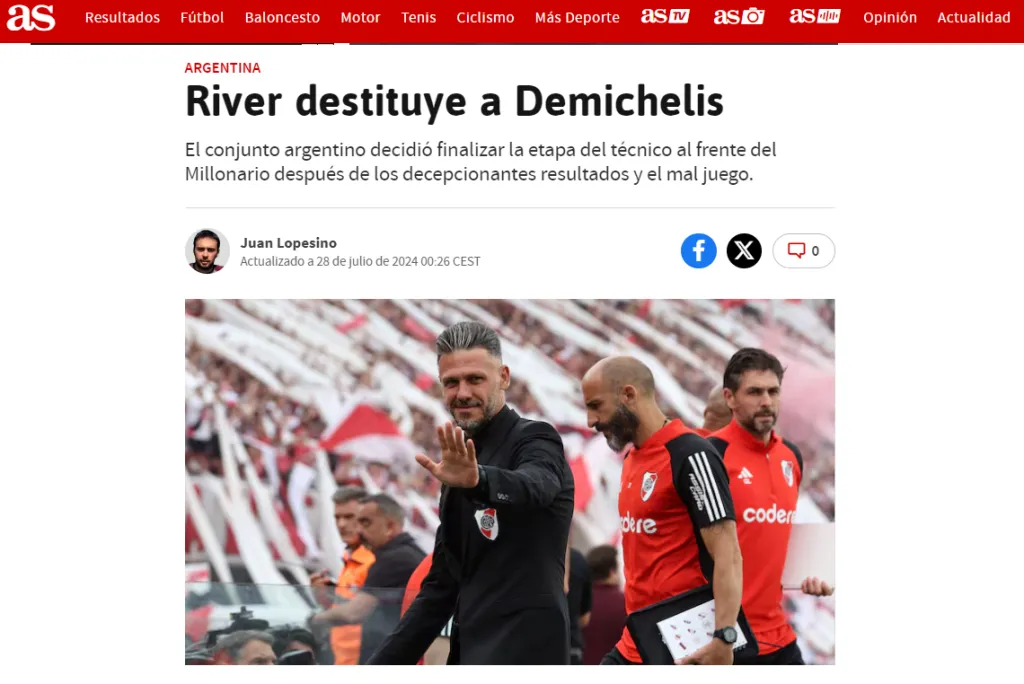 Por otro lado, Málaga Hoy publicó que ‘‘Martín Demichelis deja el banquillo de River Plate” y que la decisión de la cúpula dirigencial a cargo de Jorge Brito se adelantó a los hechos, dado que ”el partido ante el Sarmiento de Junín iba a ser una prueba de fuego para él a raíz de los malos resultados que arrastraba en las últimas jornadas”.