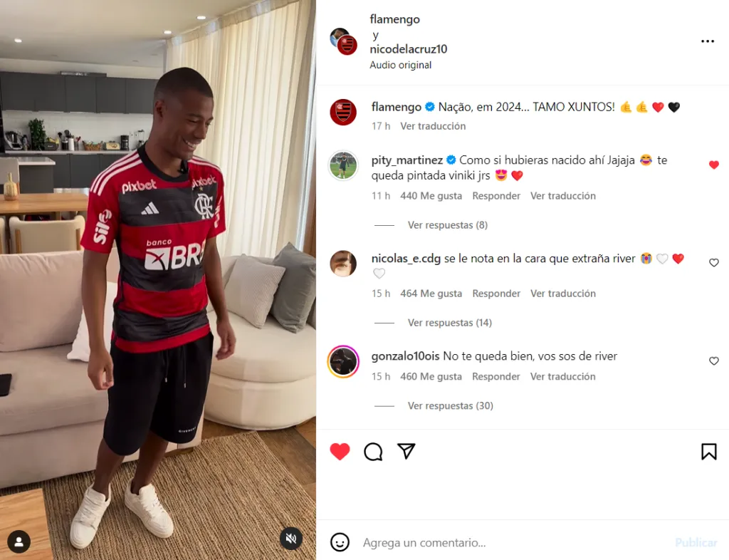 Nicolás De La Cruz realizó una publicación compartida junto a Flamengo y se lo veía al uruguayo con la camiseta puesta tirando unos pasos. El comentario más destacado lo hizo el Pity Martínez y, fiel a su estilo, fue una gastada. El mediocampista de River comentó: “Como si hubieras nacido ahí jajaja, te queda pintada Viniki jrs”, el mensaje fue acompañado de emojis risueños y afectuosos.