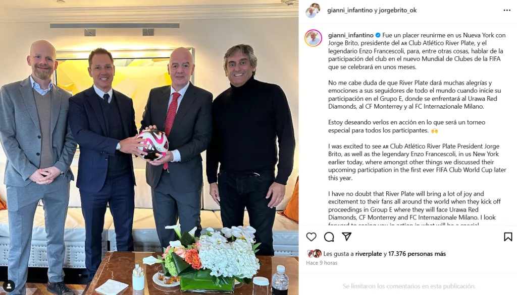 “Fue un placer reunirme en Nueva York con Jorge Brito, presidente del Club Atlético River Plate, y el legendario Enzo Francescoli, para, entre otras cosas, hablar de la participación del club en el nuevo Mundial de Clubes de la FIFA que se celebrará en unos meses.