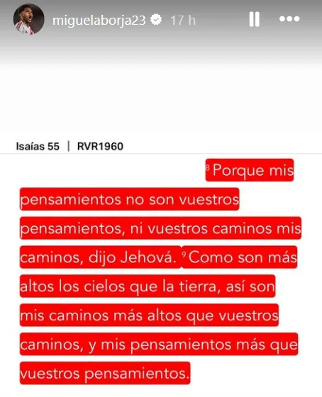 En ese sentido, no suena a casualidad que Miguel Borja haya compartido en una historia de Instagram una frase bíblica que parece ser respuesta a la sentencia de Marcelo Gallardo. “Porque mis pensamientos no son vuestros pensamientos, ni vuestros caminos mis caminos, dijo Jehová. Como son más altos los cielos que la tierra, así son mis caminos más altos que vuestros caminos, y mis pensamientos más que vuestros pensamientos”, fue el versículo que compartió el colombiano.