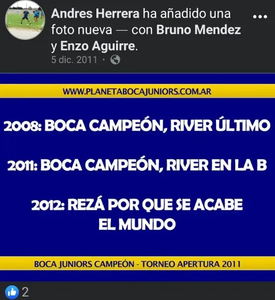 “2011: Boca campeón, River en la B. 2012: Rezá porque se acabe el mundo“, decía uno de los posteos en relación a la diferencia de categorías que existía por aquel entonces entre los clubes más grandes y convocantes del país.