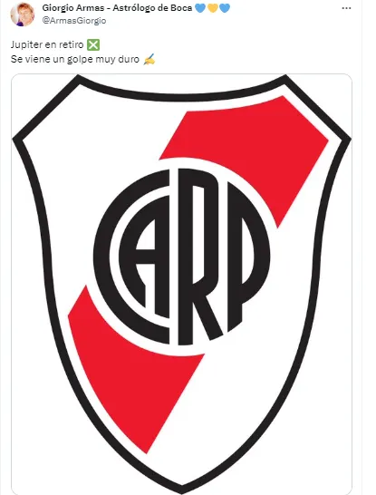 “Júpiter en retiro, se viene un golpe muy duro”, posteó junto a una foto del escudo de River, dando a entender que el equipo dirigido por Martín Demichelis podría tener un duro revés, ya sea en el plano local o en el internacional.
