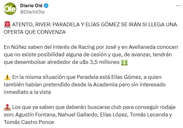 Si bien no están confirmadas sus salidas en el próximo mercado, River estará dispuesto a escuchar ofertas por Robert Rojas y Paulo Díaz. El Millonario trabaja para poder cerrar algunos jugadores de jerarquía en la zaga, como Ramiro Funes Mori y Sebastián Boselli, por lo que la superpoblación en la zona generará a sus “sacrificados”. Otro de los negociables serán Elías Gómez y José Paradela, ambos objeto de interés de Racing.