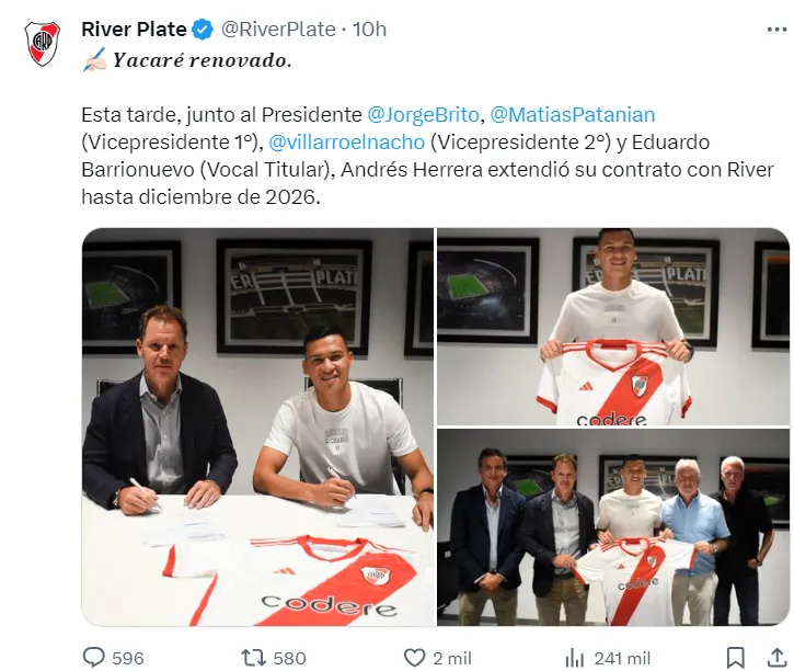 A última hora del martes, River oficializó una renovación de contrato inesperada. Andrés Herrera, uno de los laterales derechos del plantel del Millonario, extendió su vínculo hasta diciembre de 2026. La particularidad es la nueva cláusula de rescisión del jugador, que asciende a 20 millones de dólares.