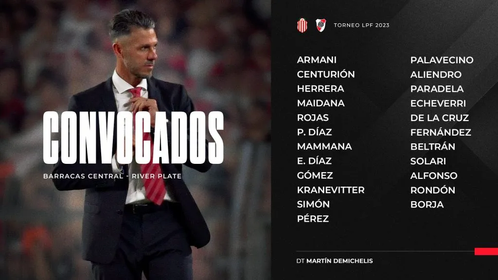El posible equipo para visitar a Barracas Central es: Franco Armani; Andrés Herrera, Robert Rojas, Paulo Díaz, Enzo Díaz; Agustín Palavecino, Enzo Pérez, Rodrigo Aliendro, Nicolás De La Cruz; Pablo Solari y Miguel Borja.