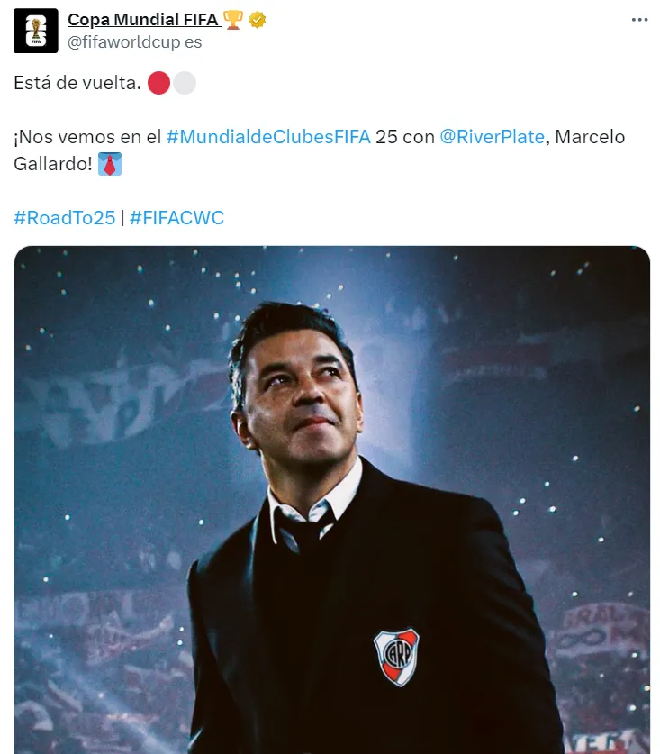 Justamente con el Mundial de Clubes 2025 en el centro de la escena, la FIFA se hizo eco del retorno del Muñeco a Núñez. La cuenta de Twitter de la casa madre del fútbol mundial @fifaworldcup_es le dio la bienvenida a Marcelo Gallardo con un posteo en Twitter: “Está de vuelta. Nos vemos en el Mundial de Clubes 2025 con River Plate, Marcelo Gallardo”.