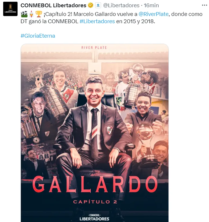 Por otro lado, la cuenta oficial de la Copa Libertadores hizo lo mismo. “¡Capítulo 2! Marcelo Gallardo vuelve a River, donde como DT ganó la Conmebol Libertadores en 2015 y 2018”, acompañado por un collage de fotos del Muñeco en su primera era. Cabe recordar que como futbolista ganó la edición de 1996 con Ramón Díaz en el banco de suplentes.