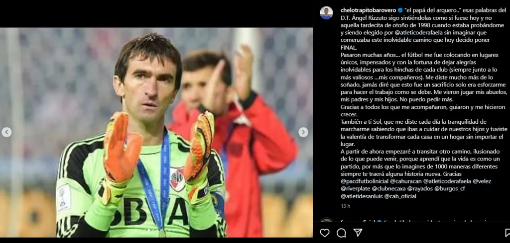 Varios ex-River se encargaron de agradecerle a Trapito por su fútbol. Uno de ellos fue Fernando Cavenaghi: “Crack Chelo querido, Lo mejor de lo mejor para esta nueva etapa, sos un enorme arquero. Crack total, pero aún más como persona. Hermoso haber compartido tan lindos momentos“.