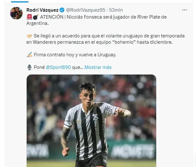 Según informa el periodista Rodrigo Vázquez, Fonseca será nuevo jugador de River, y agrega que se llegó a un acuerdo para que el volante uruguayo de gran temporada en Wanderers permanezca en el equipo “bohemio” hasta diciembre, por lo que el volante de 24 años firma el contrato hoy y vuelve a Uruguay.