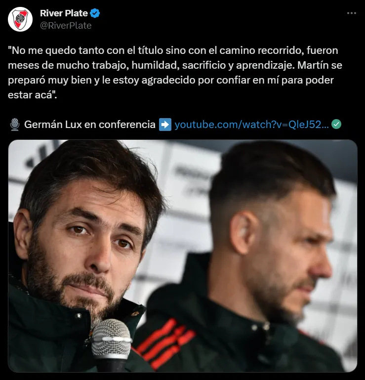 Así las cosas, Germán Lux, excompañero dentro del campo de juego y actual integrante del cuerpo técnico, hizo una gran revelación: “A Martín lo conozco desde hace muchos años. Fuimos compañeros. Cuando surgió la posibilidad y tenía otras ofertas, le dije que era River. Por suerte me hizo caso y acá está”.