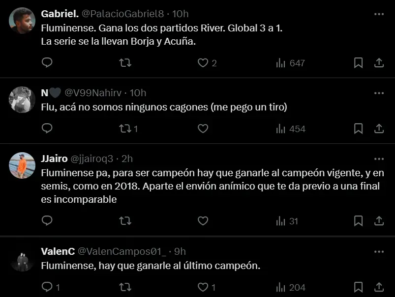 Incluso, uno de los tantos hinchas de River que eligió a Fluminense lo hizo por la famosa “maldición de Alianza Lima”, que consiste en que ningún equipo que haya compartido grupo con el conjunto peruano luego pudo coronarse campeón de la Libertadores, por lo que estimaron mediante lo místico que el mejor rival era el Flu, ya que no iba a lograr pasar a la final debido a esta reconocida maldición en Sudamérica.