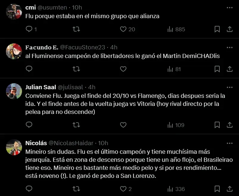 Otros, en tanto, se inclinaron por Mineiro: “hay que tratar de sacarse la espina del baile que nos pegaron en los cuartos de 2021” o “Mineiro es bastante más medio pelo y si por es rendimiento… le ganó de pedo a San Lorenzo” fueron los más destacados que se inclinaron por el equipo de Gabriel Milito.
