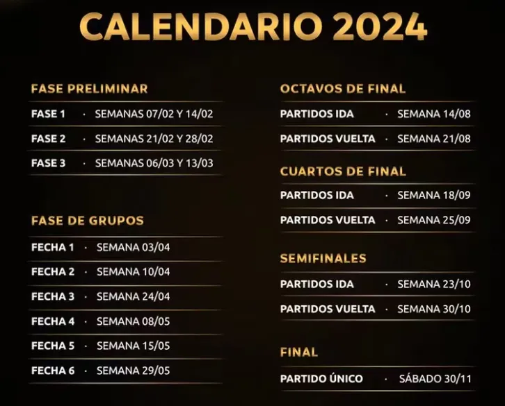 CONMEBOL confirmó la disposición del calendario para sus principales competencias en el 2024, incluyendo la Copa Libertadores: el inicio de las cuatro series de cuartos de final está estipulado para la semana del 18 de septiembre para los partidos de ida, mientras que la vuelta de cada llave se jugará en la semana del 25 del mismo mes.