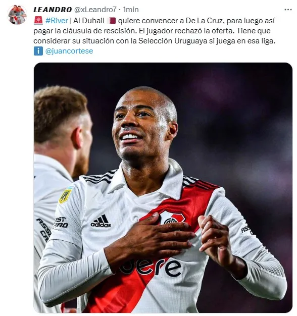 El Al-Duhail dirigido por Hernán Crespo intenta seducir al jugador con “un contrato millonario”, informó el periodista Germán García Grova. Desde River y Liverpool (Uruguay), dueños de las dos mitades del pase del volante charrúa, esperan embolsar alrededor de siete millones de euros por la transferencia definitiva de De La Cruz hacia el exterior.