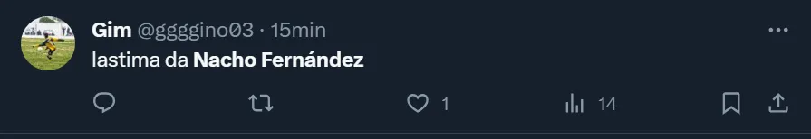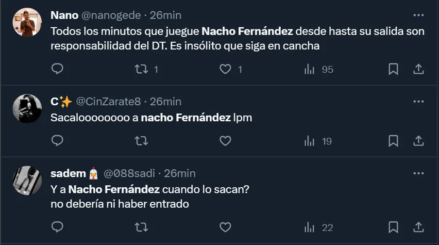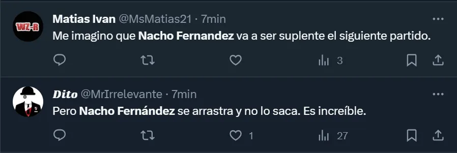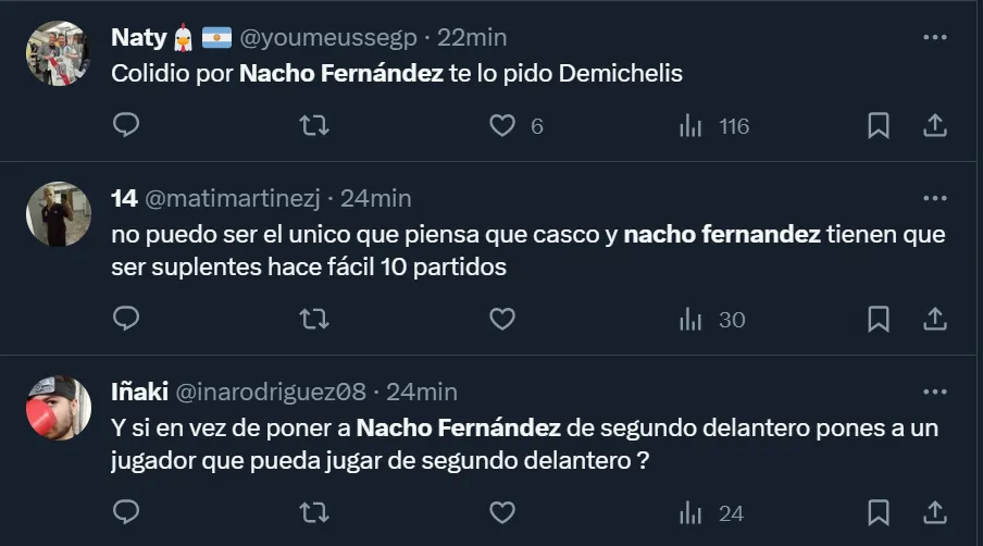 Si bien es de los más queridos por la fanaticada riverplatense, a través de las redes sociales hubo muchísimo descontento para con Nacho Fernández por lo que vienen siendo sus últimos partidos, en los que lo han notado muy inconexo en relación a sus compañeros. Por lo tanto, el pedido fue unánime: que Demichelis lo reemplazara.