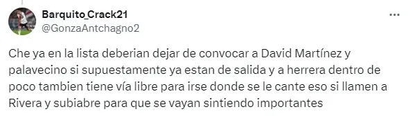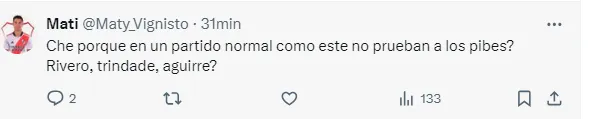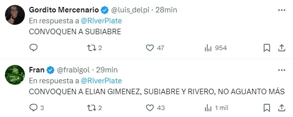 “Convoquen a Elian Giménez, Subiabre y Rivero”, “¿Y Subiabre para cuándo?”, “Por qué en un partido normal como este no prueban a los pibes? Rivero, Trindade, Aguirre”, “Llamen a Rivero y Subiabre para que se vayan sintiendo importantes”, fueron algunos de los comentarios de los hinchas pidiendo por los juveniles.
