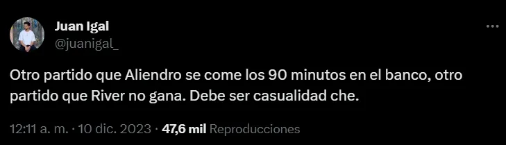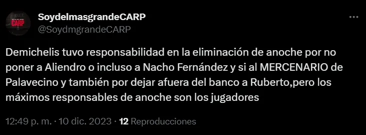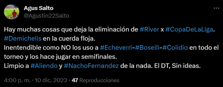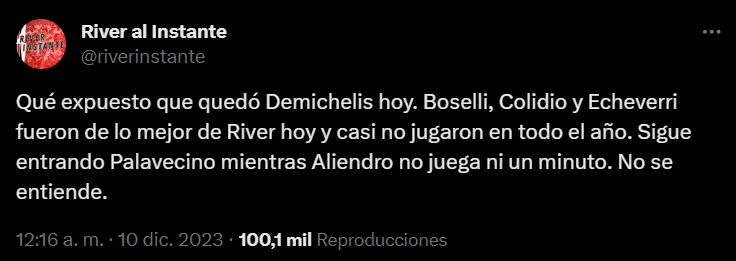 Lógicamente, y, tal como suele suceder partido tras partido, esta realidad se trasladó a las redes sociales. De hecho, por intermedio de las mismas, los hinchas de River explotaron de furia porque Demichelis no puso a los mencionados mediocampistas, los cuales parecían estar muy ansiosos por saltar al verde césped para ayudar al Millonario a ganar.