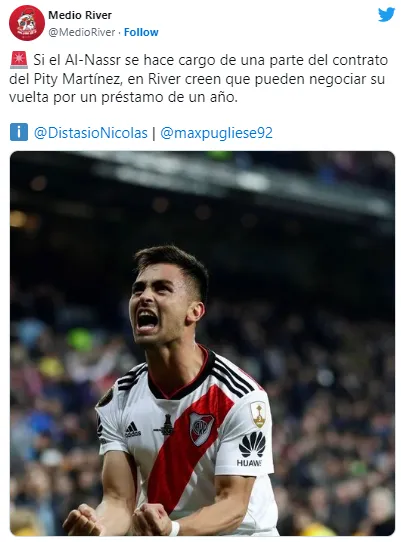 “Si el Al-Nassr se hace cargo de una parte del contrato del Pity Martínez, en River creen que pueden negociar por un préstamo por un año y traerlo de regreso“, dijo el panelista del programa que conduce Mariano Closs en ESPN. La maniobra no es sencilla, claro está, ya que el equipo árabe pretende venderlo para poder reinvertir el dinero en más refuerzos. No obstante, en Núñez no pierden la ilusión. ¿Vuelve?