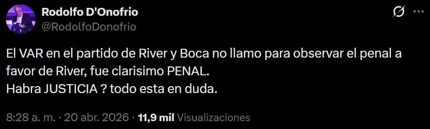 A través de sus redes sociales, este lunes por la mañana, Rodolfo D´Onofrio publicó: “El VAR en el partido de River y Boca no llamo para observar el penal a favor de River, fue clarísimo PENAL. Habrá JUSTICIA? Todo está en duda”. Fue claro el reclamo del ex máximo mandatario del Millonario, que históricamente estuvo en la antípodas de la gestión de Claudio Tapia.