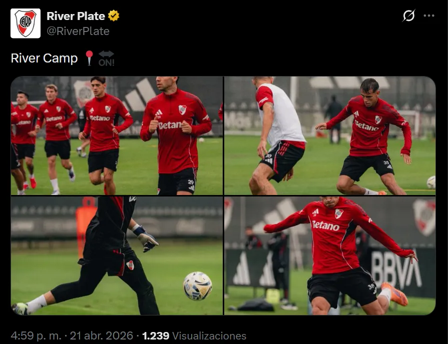 Con el regreso a los entrenamientos, la primera publicación que se llevó a cabo en la cuenta de X fueron cuatro imágenes de lo que ocurrió en el trabajo matutino, bajo la lluvia, en las inmediaciones de River Camp. En cuanto al texto, solo acudieron a mencionar el predio donde se entrenan los futbolistas.