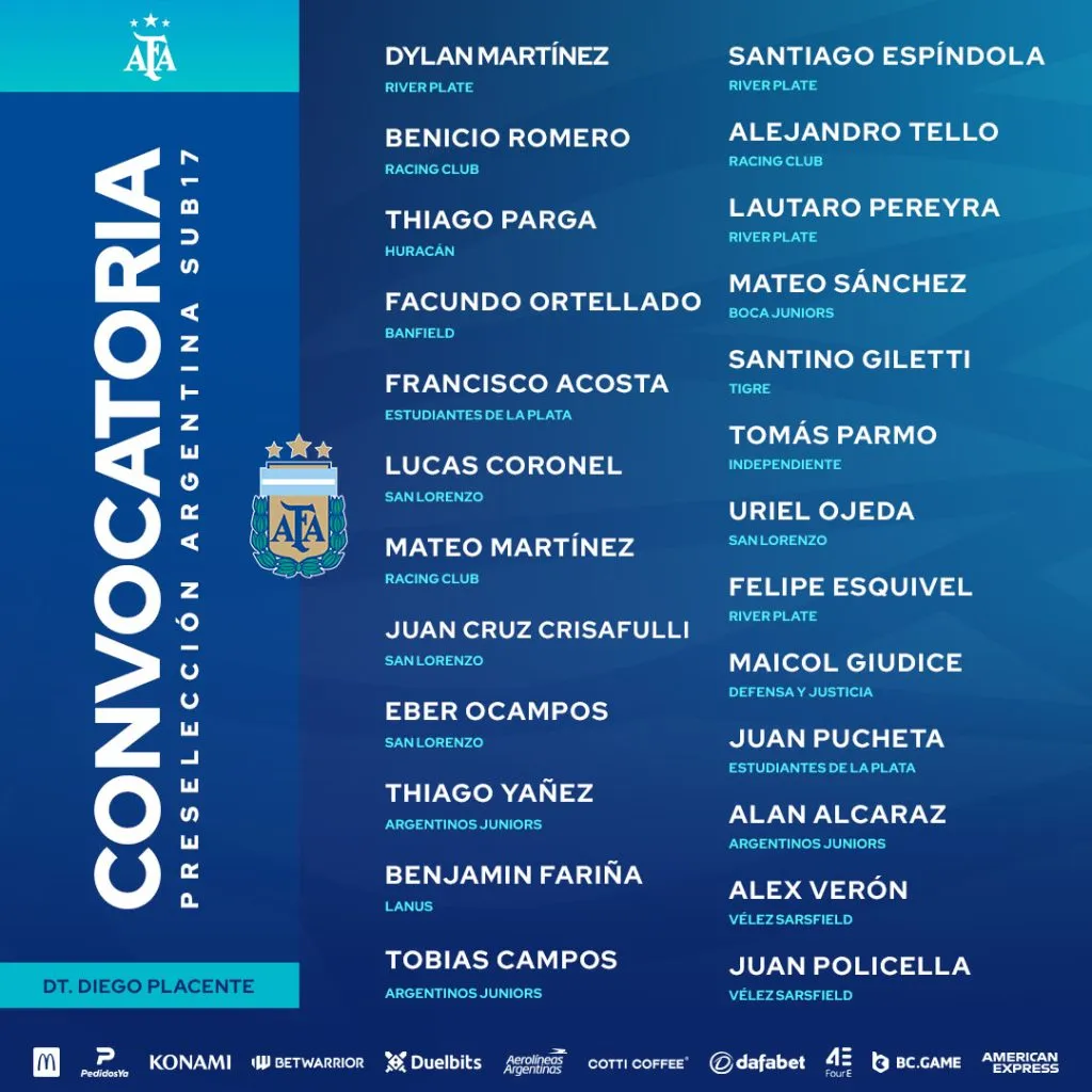 Los convocados por Diego Placente para la Selección Argentina Sub 17