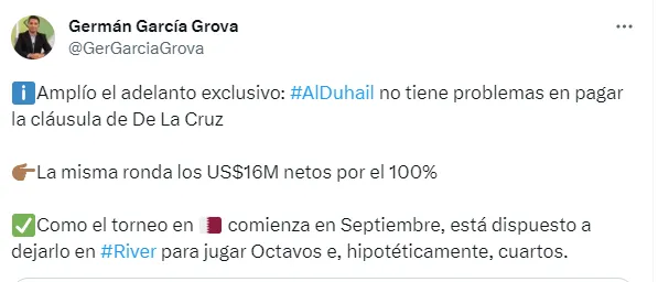 El equipo qatarí, que es dirigido por Hernán Crespo, es quien corre con ventaja en la puja por el mediocampista, ya que acorde a lo que informa el periodista Germán García Grova, no tiene problemas en pagar la cláusula de De La Cruz (que ronda los 16 millones de dólares netos por el 100% del pase), y como el torneo en Qatar comienza en septiembre, está dispuesto a dejarlo en River para disputar los octavos e, hipotéticamente, cuartos de Copa Libertadores.