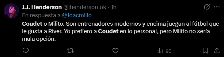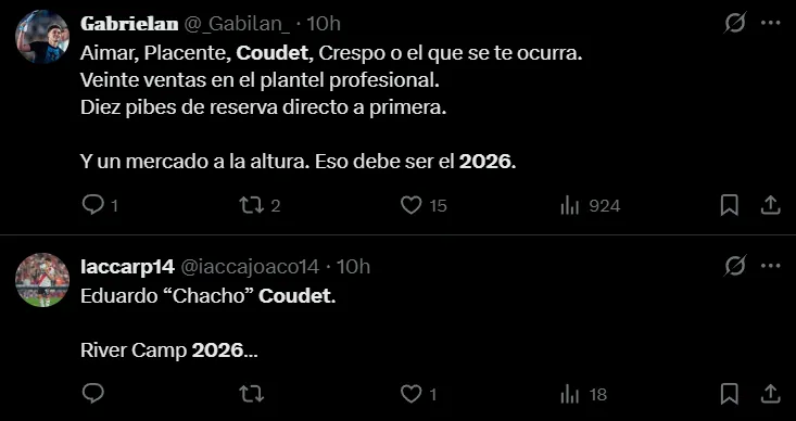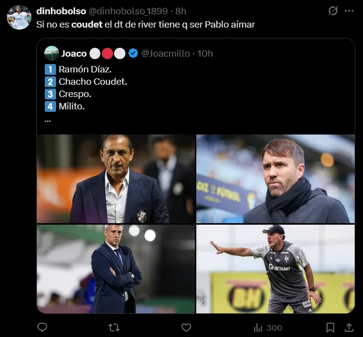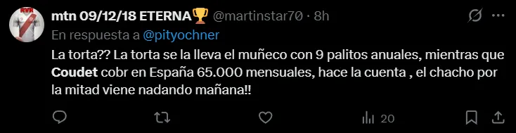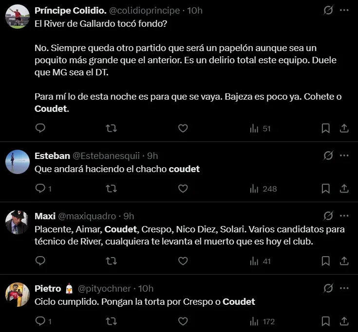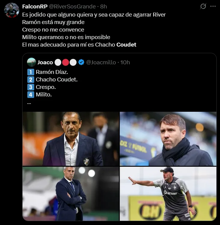 “Es jodido que alguno quiera y sea capaz de agarrar River. Ramón está muy grande. Crespo no me convence. Milito es imposible. El más adecuado para mí es Chacho Coudet”, se expresó uno de ellos. “Coudet o Milito. Son entrenadores modernos y encima juegan el fútbol que le gusta a River. En lo personal, prefiero a Coudet”, señaló otro. “Gallardo tiene que renunciar. River tiene que contratar a Crespo o Coudet, a un scouting profesional y despedir a diez jugadores mínimo”, abrió el juego un tercero. “La torta se la lleva el Muñeco con 9 palitos anuales, mientras que Coudet cobra en España 65 mil mensuales. Hacé la cuenta. El Chacho por la mitad viene nadando mañana”, dijo otro.