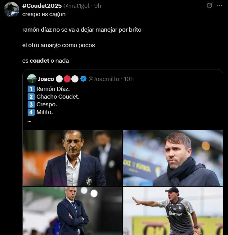 Un nombre que se repitió tanto en Córdoba como en redes fue el de Eduardo Coudet, de exitoso paso por el club como futbolista y hace años afianzado como entrenador con rodaje internacional, que actualmente se desempeña al frente del Deportivo Alavés en LaLiga de España.