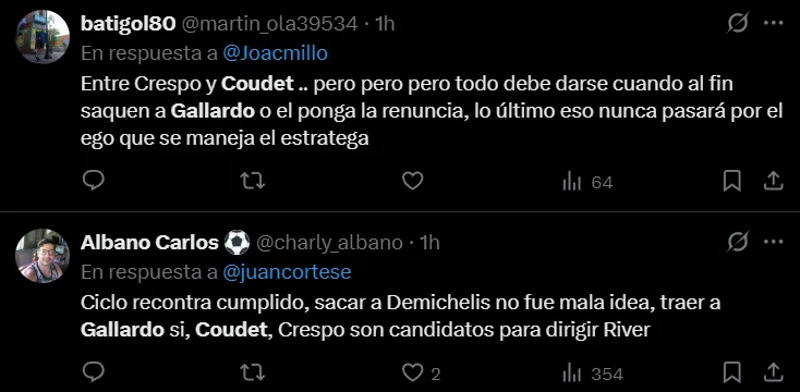 Ya entre los hinchas que emprendían la retirada del Estadio Mario Alberto Kempes hubo manifestaciones en contra de las decisiones y los modos del Muñeco, así como relacionadas a posibles candidatos a reemplazarlo. En ambas direcciones, esas expresiones continuaron en las redes sociales.