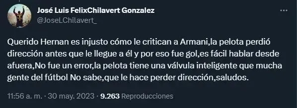 “Es injusto como le critican a Armani. La pelota perdió dirección antes que le llegue a él y por eso fue gol. Es fácil hablar desde afuera. No fue un error, la pelota tiene una válvula inteligente que mucha gente del fútbol no sabe que le hace perder dirección”, exteriorizó Chilavert.