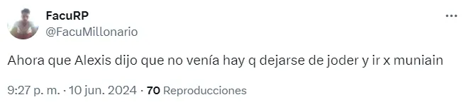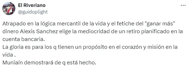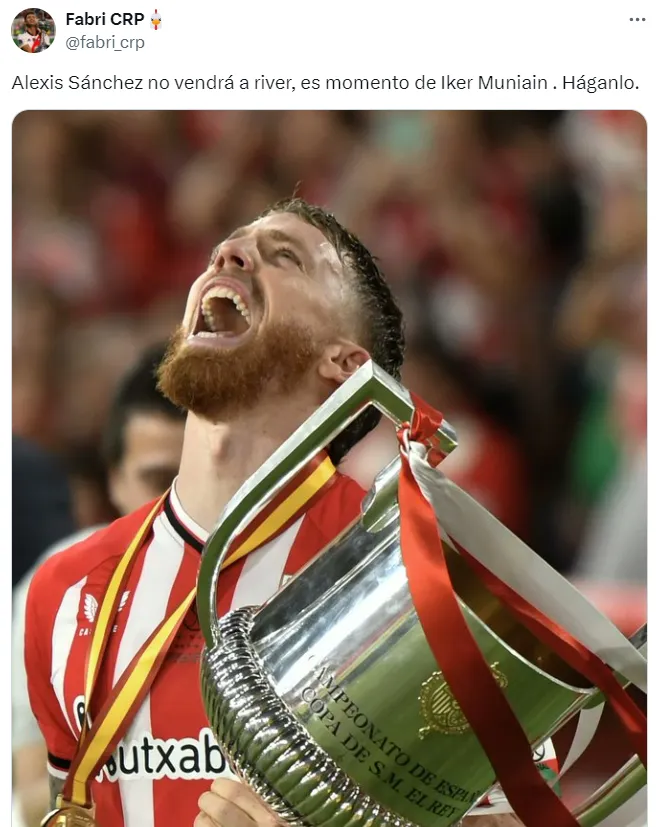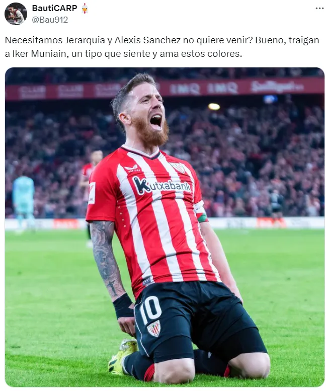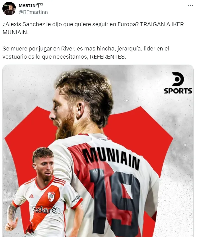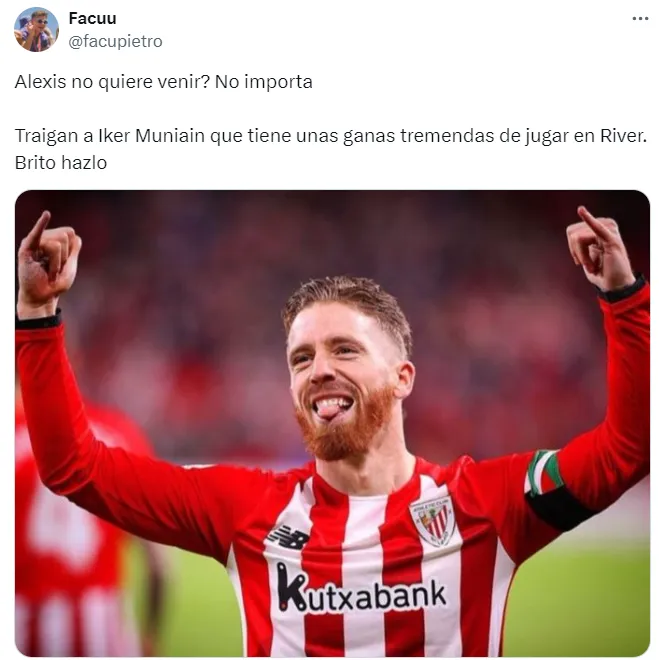 “¿Alexis Sánchez dijo que quiere seguir en Europa? Traigan a Iker Muniain. Se muere por jugar en River, es más hincha, jerarquía, líder en el vestuario. Es lo que necesitamos, referentes“, opinó uno de los hinchas.