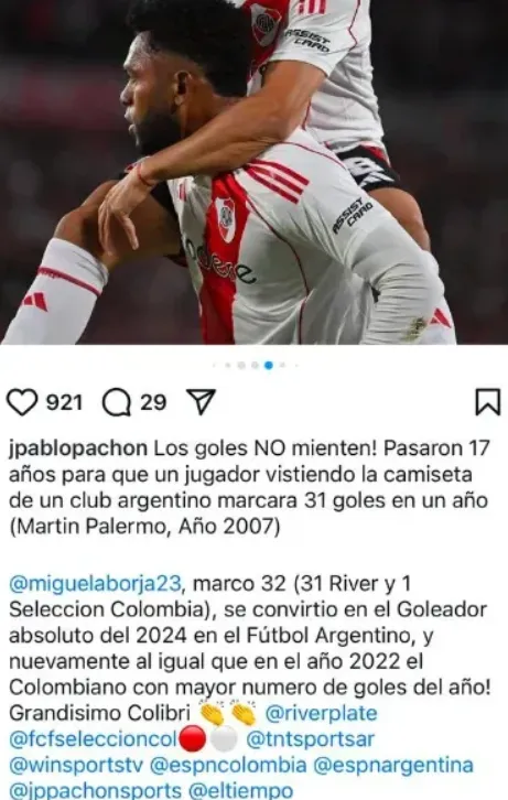 “Miguel Borja marcó 32 (31 en River y 1 en la Selección Colombia), se convirtió en el goleador absoluto del 2024 en el fútbol argentino nuevamente, al igual que en el año 2022, el colombiano con mayor número de goles del año. Grandísimo Colibrí”, sentenció.