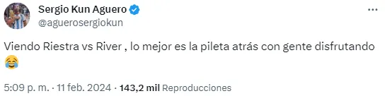 En el inicio del primer tiempo, el exdelantero de la Selección Argentina se hizo presente en X y lanzó: “Viendo Riestra vs River , lo mejor es la pileta atrás con gente disfrutando“.